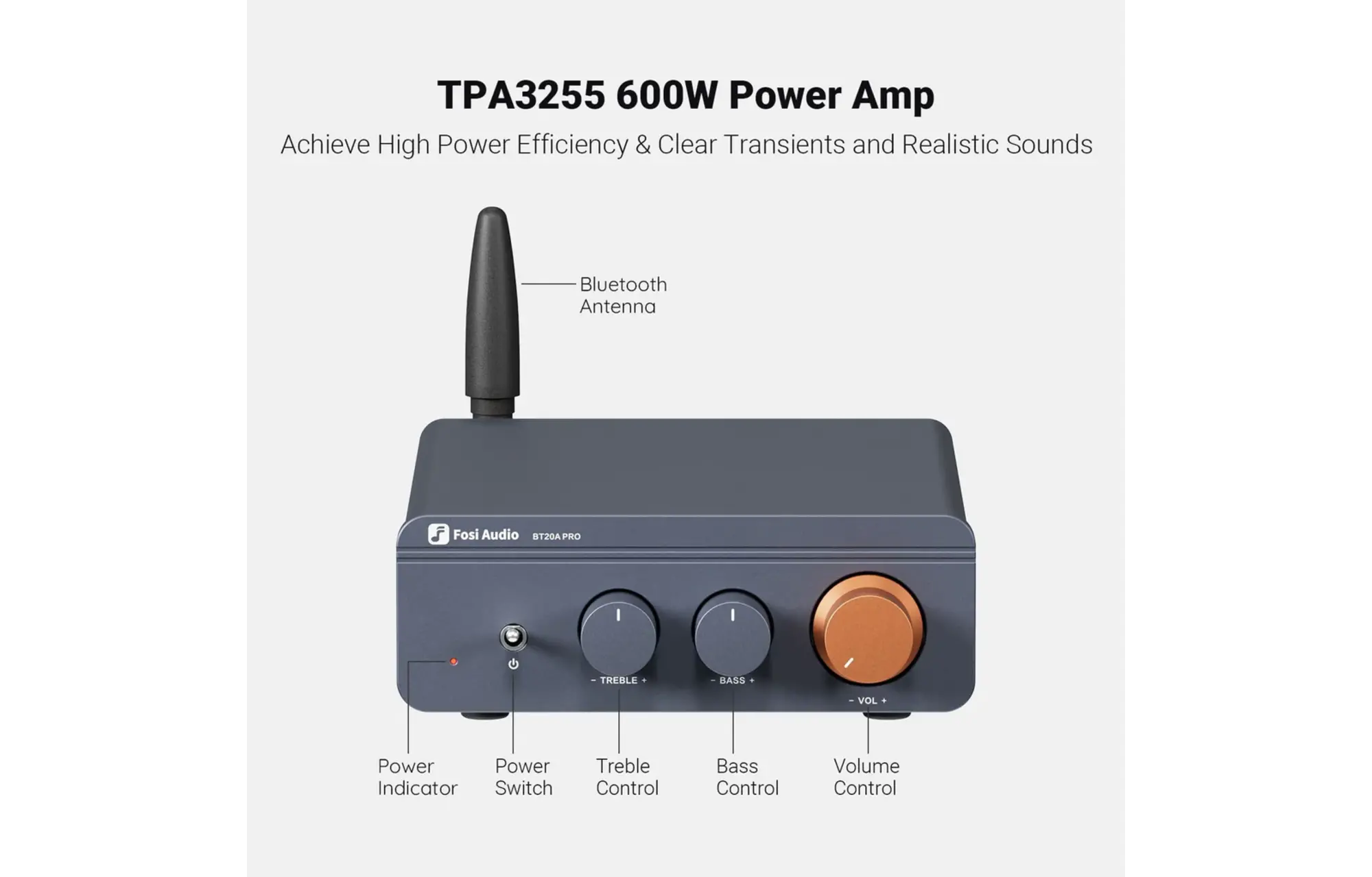 Fosi Audio BT20A PRO leverer imponerende effekt takket være Texas Instruments' TPA3255-forstærkerchip, som sørger for et klart, detaljeret og dynamisk lydbillede – selv når du spiller højt. Den indbyggede Bluetooth 5.0-forbindelse gør det nemt at streame musik direkte fra din smartphone, tablet eller andre enheder, og forstærkeren husker dine tidligere parringer, så du er klar til at lytte med det samme. Med separate knapper til justering af bas og diskant kan du nemt tilpasse lyden, så den passer præcis til din smag og din opsætning.