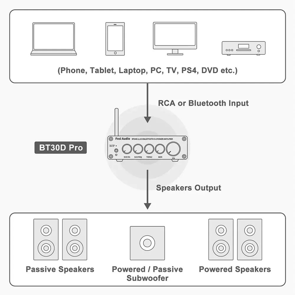 Oplev din musik, film og spil på en helt ny måde med Fosi Audio BT30D PRO 2.1 effektforstærkeren. Denne alsidige forstærker giver dine passive højttalere og subwoofer et markant løft og leverer en energisk og detaljeret lydoplevelse. BT30D PRO er bygget til at drive både højttalere og subwoofer med imponerende styrke, så du får alt fra klare højtoner til dyb, omsluttende bas.