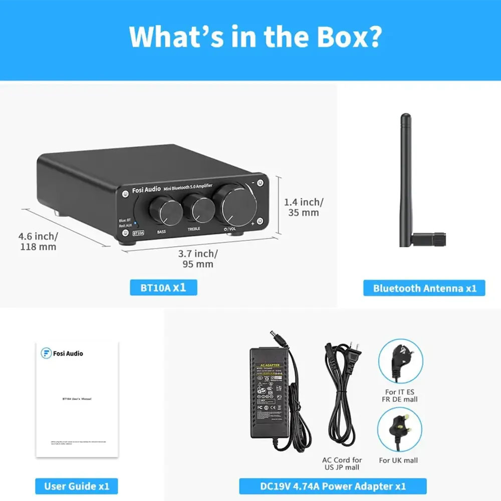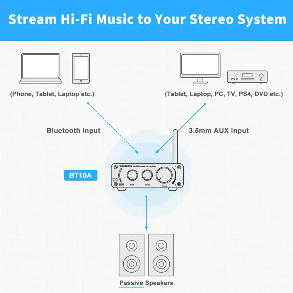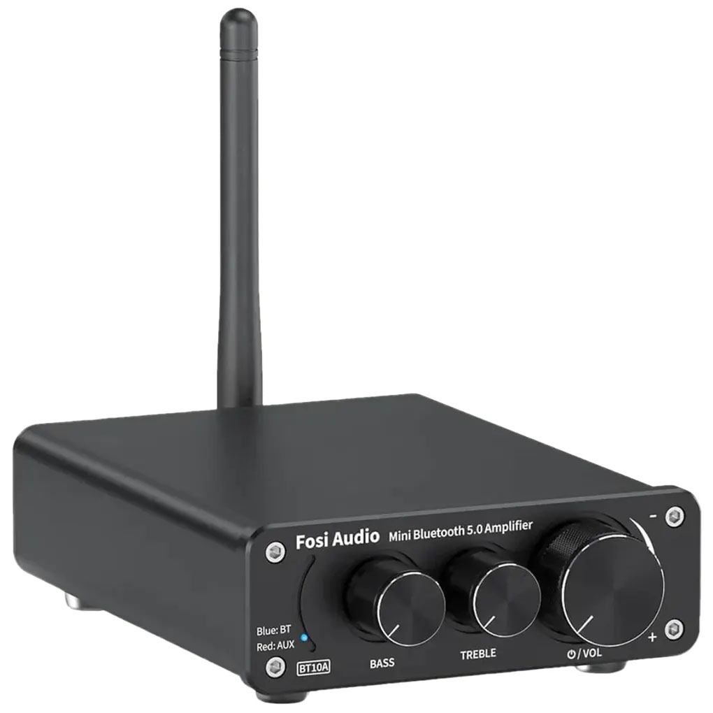 Opgrader dit lydsystem med Fosi Audio BT10A Stereo Forstærkeren. Denne lille, men kraftfulde forstærker giver dine passive højttalere nyt liv og tilbyder en enkel måde at forbedre din musikoplevelse på – både ved skrivebordet og i hjemmet.