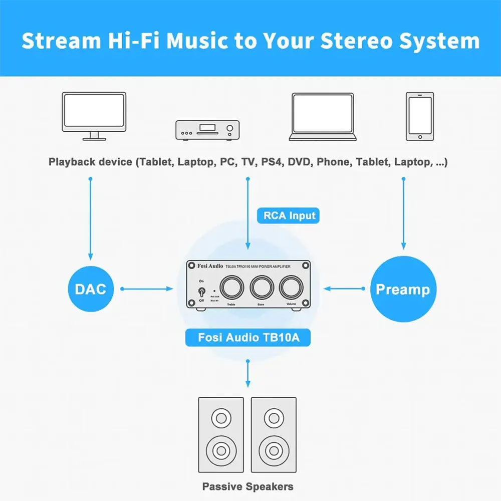 Denne to-kanals forstærker passer til en bred vifte af passive højttalere og integreres problemfrit i hjemmets lydopsætning, hvilket skaber en fordybende lydoplevelse i små til mellemstore rum. Fosi Audio TB10A er den ideelle løsning til at opgradere hjemmebiografer, skrivebordsopsætninger eller personlige lydstationer med høj kvalitet og fleksibilitet.